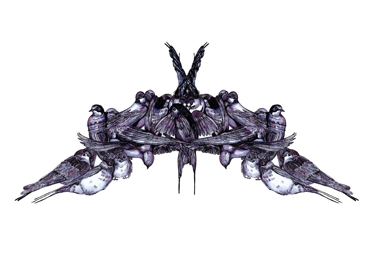 Using the old Rorschach ink blot psychological tests as a my inspiration, I wanted to show how these tests were misleading by filling the shape with images that reference the natural world and lifecycles, with the swallow over watched by a well hidden sparrow hawk.