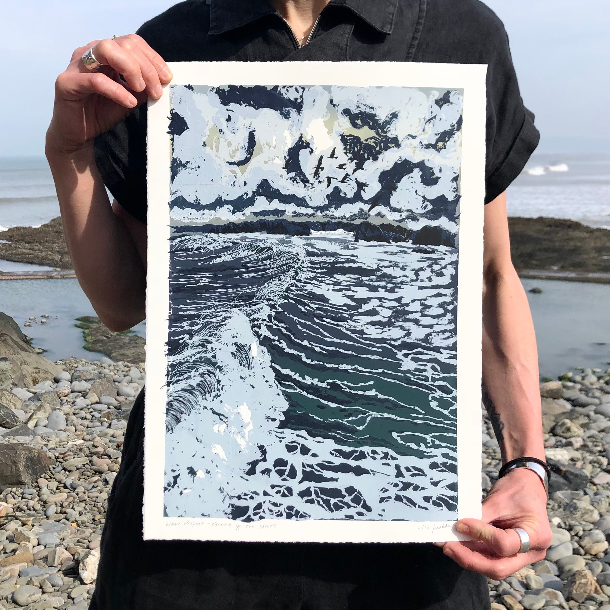 A print to show the feeling of being in the sea on one of those days when the waves line up and curve around the bay. Big, clean, feisty and so good for surfing, but so many waves means sometimes you sit and watch some good ones pass under you as you catch your breath ready to go again on another best wave of the day.